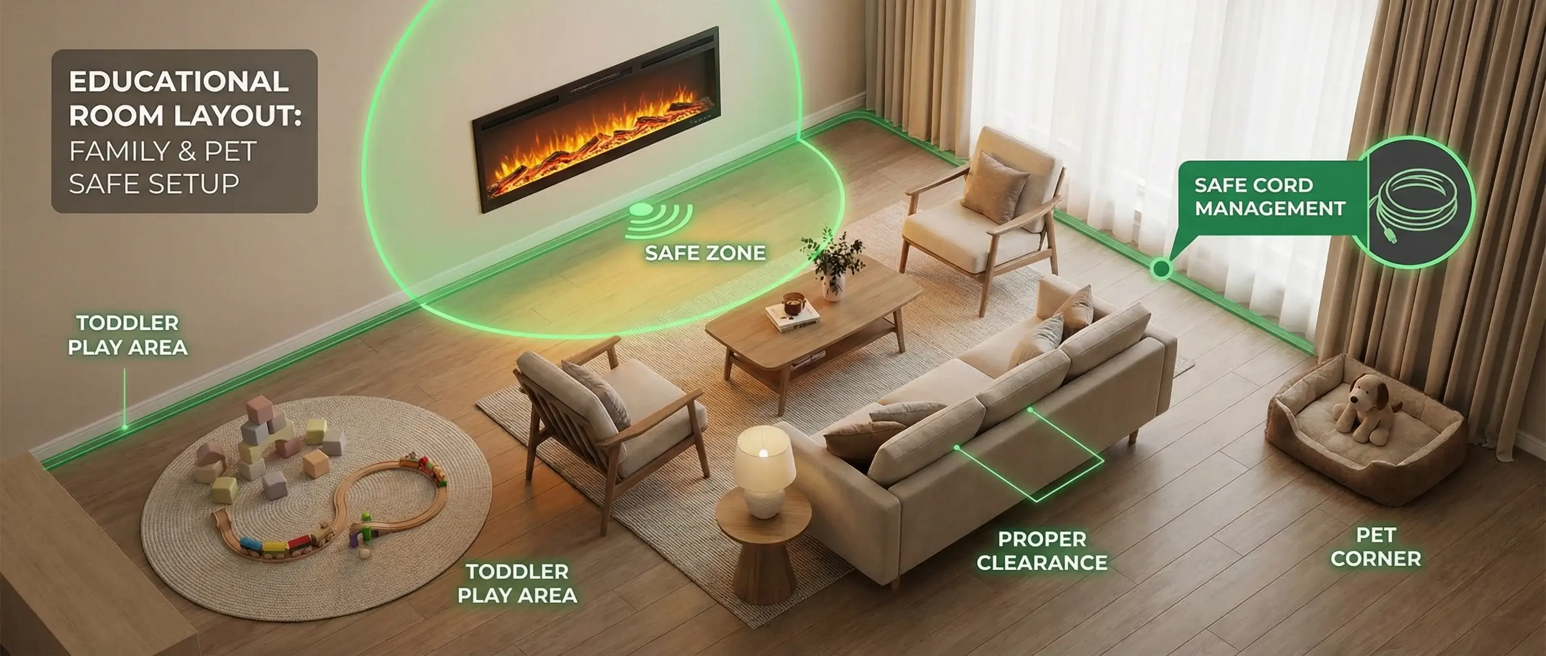 With basic precautions, electric fireplaces offer peace of mind for families with kids and pets.